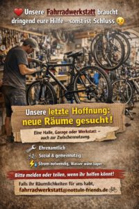Der Mietvertrag der Fahrradwerkstatt wurde zu Ende März gekündigt. Wir suchen dringend nach neuen Räumlichkeiten!