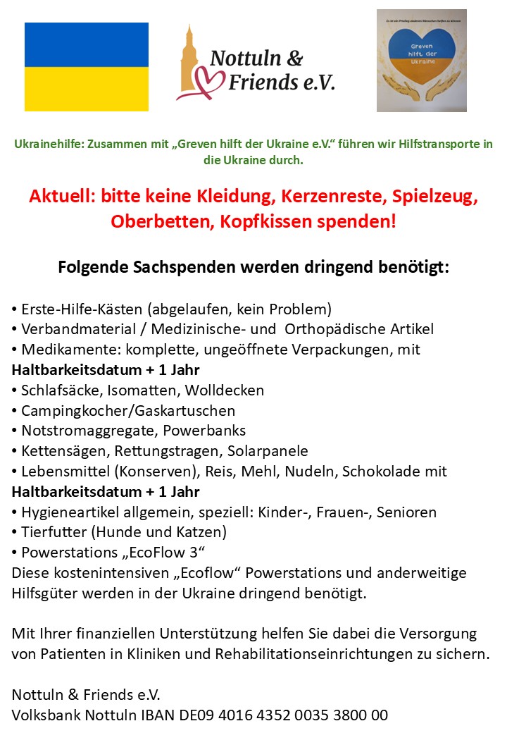 Mit dem Verein „Greven hilft der Ukraine e.V.“ führen wir Hilfstransporte in die Ukraine durch.