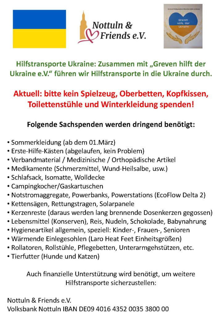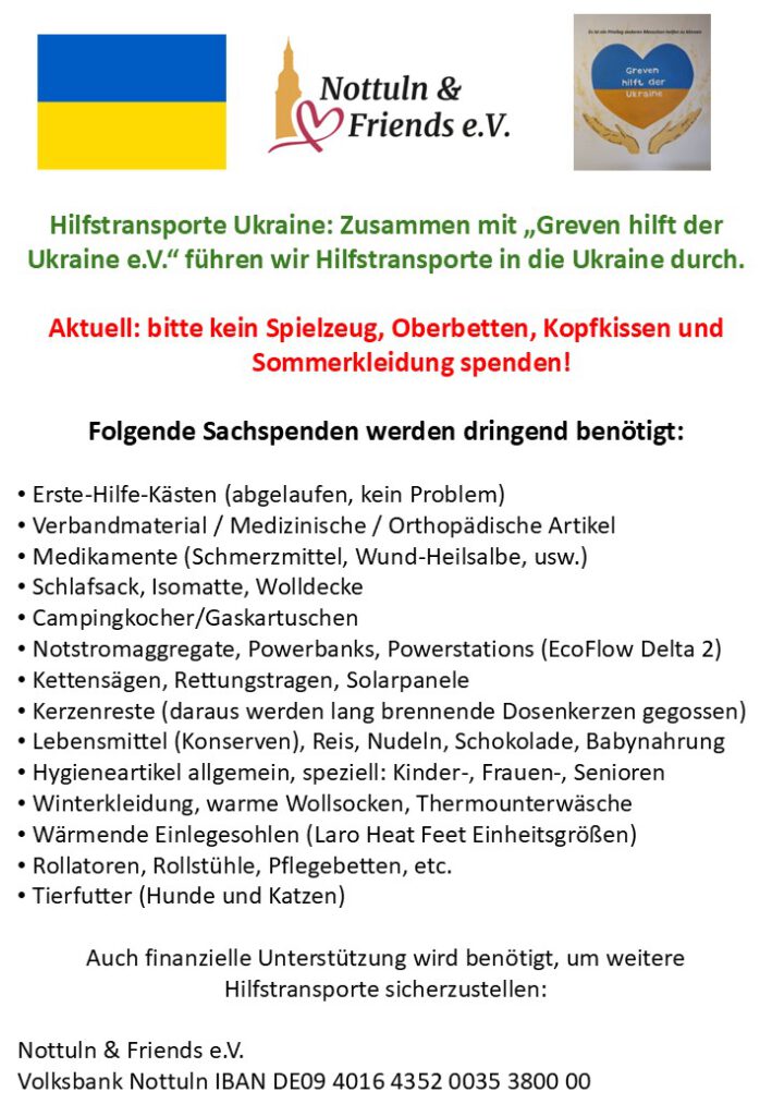 Mit dem Verein „Greven hilft der Ukraine e.V.“ führen wir Hilfstransporte in die Ukraine durch.
